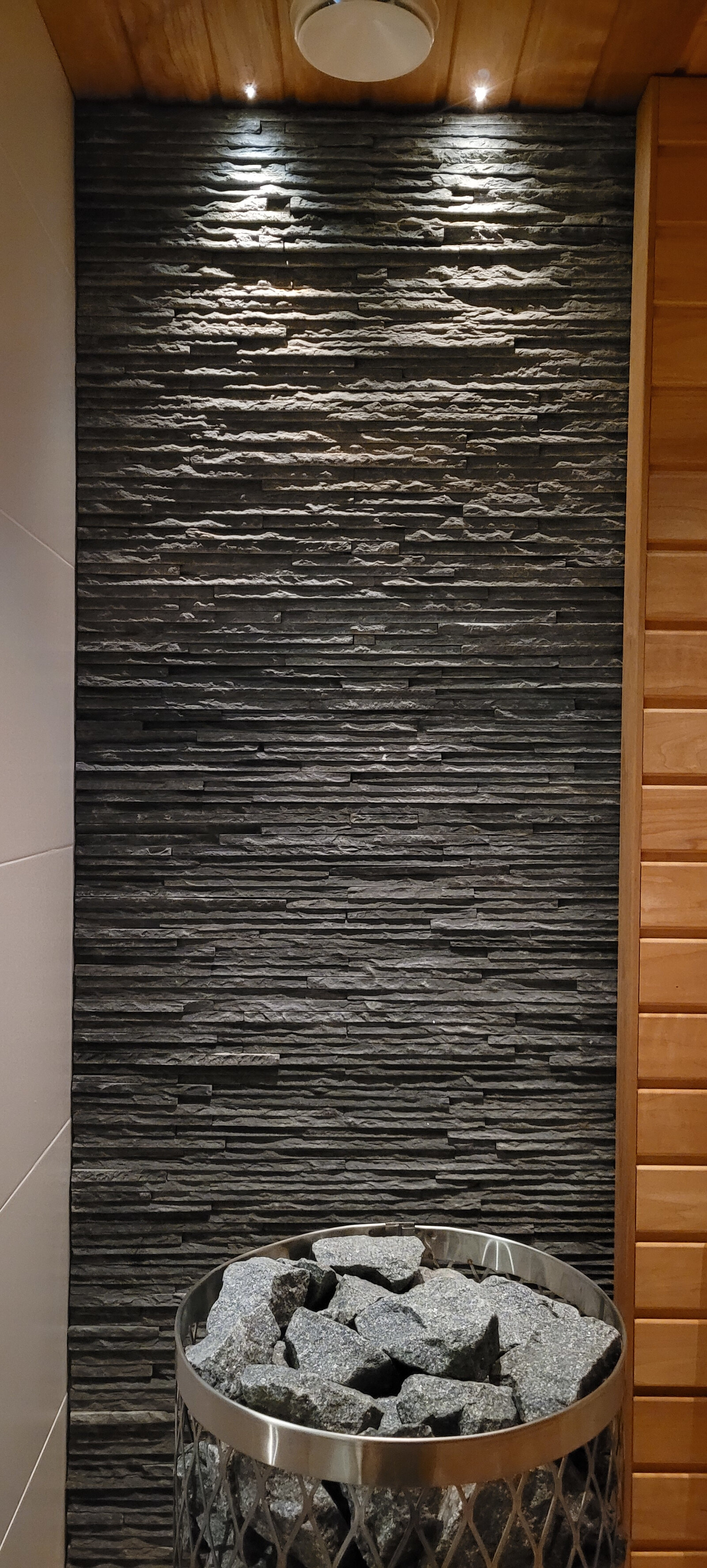 Shanghai Pikku Pippuri on modernin rakentajan unelma. Tämä eläväpintainen kivielementti koostuu mustanharmaista, noin 1 cm korkeista lohkoreunakivistä ja on kokoa 60x15 cm. Ladonta sisältää 11/12 kiviriviä 15 cm korkeudella, ja kivien paksuus vaihtelee 1–2 cm välillä. Pikku Pippurilla voit esimerkiksi luoda vaikuttavia tehosteseiniä olohuoneeseen, lisäät tunnelmaa kiukaan taakse tai tuot silmäniloa keittiön välitilaan. Kivi on monipuolinen ja sopii erinomaisesti erilaisiin tiloihin. Suosittelemme käsittelemään kiven suoja-aineella tiloissa, joissa se altistuu vedelle tai rasvalle. Suojaukseen käyvät Nanobauerin tuotteet tai vastaavat. Shanghai-tuotesarjamme ovat enemmän kuin vain verhoilukiviä – ne ovat tunnelman luojia tilaan kuin tilaan! Shanghai Pikku Pippuri tuo luonnonkauneuden ja modernin tyylin kotiisi – ole valmis tekemään vaikutus! TUOTTEEN OMINAISUUDET Kiiltoaste: matta Pakkasenkesto: Kyllä Soveltuu lattiakiveksi: Ei Soveltuu kosteisiin tiloihin: Kyllä Lämmön kesto: Hyvä 60x15 cm 105,80 €/m2 Koko: 60x15 cm (EAN: 6430040740477) Myyntierä: 0.720 m2 / ltk Paino: 35 kg / m2 Värisävy: tumman harmaa Kuvaus: ohut Tuote on esim. sisäseinien verhoukseen tarkoitettu verhoilukivi, joka ei tarvitse saumausta. Suosittuja käyttökohteita seinäverhouksiin ovat olohuoneen, eteisen ja keittiön välitilan verhoilu. Luonnonkivelle ominaisesti voi kivessä olla erivärisiä juovia tai laikkuja. Suositellaan asennettavaksi tiililadonnalla puskuun.